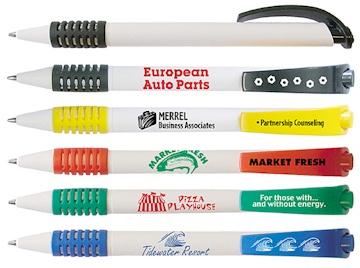 | White Click Ball Point Pens w/ Colorful Trim: A nice middle of the road writing pen with vibrant colored trim, comfortable grip at bottom. Click the top to write. We'll print your information in a contrasting color for nice eye appeal. Idea: For Valentine's Day, choose red trim and we'll add red hearts around your information. For Patriotic Holidays, choose blue & red, and we'll print your info. in blue or red. For St. Patrick's Day, choose green, and we'll add a shamrock around your information. For Christmas, choose red and green, and we'll add candy canes. For anytime, order all assorted colors! |