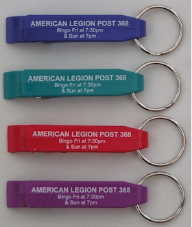| Beverage Wrench: Great item for keeping the Ladies nails from breaking! This beverage wrench will open bottles as well as soda / beer can tabs. These openers are made in the U.S.A and come with a keyring attachment! Choose from a variety of colors including assorted neon colors (which are very popular with Bingo players) IDEA! For any Patriotic holiday, choose red & blue and we'll add a waving flag next to your information in white. Optional Slogans: Compliments Of: United We Stand! |