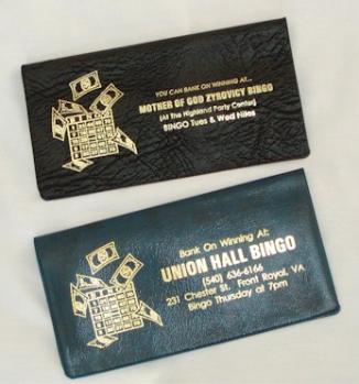 | Vinyl Checkbook Cover: Something just about everyone uses! Durable vinyl cover comes in a variety of colors. We'll print a logo of a bingo card with money on the front, next to your information in metallic gold print. Optional Slogans: Bank On Winning At: You Can Bank On Winning At: |