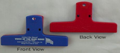 | 4" Wide Chip Clip: Great item for keeping those snacks, cereal, pet food bags sealed and fresh. These clips are made in the U.S.A and have excellent holding/ clamping power! Choose from a variety of colors including assorted neon colors (which are very popular with Bingo players) IDEA! For any of Patriotic holiday, we can make a clip which is 1/2 red & 1/2 blue (one side each color). We'll print in white to complete the red, white & blue theme! Optional Slogans: Proud To Be An American! United We Stand! We Remember Our Heroes! Happy 4th Of July From... The Freshest Game In Town! |