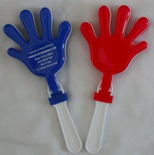 | Hand Clapper: These hand clappers with plastic handles produce a stimulating hand-clapping noise & are great for signaling a BINGO has been won! Great visibility in the hall when your player holds them up. Comes in Red, Black, or Blue with White back & handle. We'll print your information in white or gold on the colored hand side for maximum advertising impact. Optional Slogans: I Was Winner at: Happiness is Yelling Bingo at: |