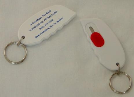 | Carton Cutter Keyring: A handy item to keep in the purse, car or bingo bag. Useful for multiple things, including cutting carpet remnants (it's that strong, durable & versatile)! Safety slider on back. Great everyday item for your customers. We can print a bingo card next to your information on the front or a variety of other logos (including yours). IDEA! For Father's Day, we can add the slogan: Happy Father's Day From: Optional Slogans with Bingo card: A Cut Above the Rest! Compliments of: Optional Slogans with Flag: Proud to be an American! We Remember our Heroes! United we Stand! |