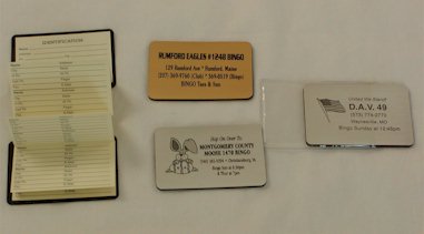 | Magnetic Address Book: This is a very handy item and loved by so many customers! The magnetic force holds the book together when not in use. Simply pull apart to reveal 10 pages of accordion-style folded address book paper. Vinyl outer sleeve protects finish from getting scratched. Choose from Metallic gold or silver. We print in black for a nice contrasting impact. We can also add a bingo card next to your information at no additional charge. IDEA! For any Patriotic holiday, we'll add a waving flag next to your information for a patriotic touch (pictured right) Optional Slogans: Proud to be an American! United we Stand! We Remember our Heroes! Happy 4th of July From: We Remember Sept. 11, 2001 |