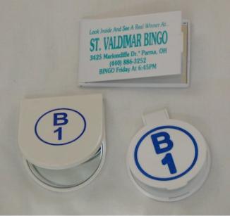 | Mirrors: A handy, and much used Mother's Day gift! Durable plastic clamshell case hold mirror safely inside. Choose from round or rectangular shape. We'll print your information on the outside front cover for maximum advertising impact. We can also add a bingo card or rose for a nice touch. NOTE: Choose from white or black case for round mirror, only white available for rectangular shape. Optional Slogans: Happy Mother's Day From... Compliments of: |