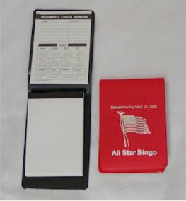 | Patriotic Note Pad: This is a very handy item to keep in the purse,bingo bag, or car for those times when a piece of paper is needed! Comes with sturdy vinyl cover, 2 inner vinyl sleeves (upper holds 2 yr. calendar card and lower holds pad). We've added 100 sheets of paper in pad! Show your patriotic spirit by giving this to your customers on any of the patriotic holidays, such as Presidents Day, Memorial Day, 4th of July, Labor Day. We'll print your information on the front and add a waving flag for that special touch! Optional Slogans: Proud to be an American! United we Stand! Happy 4th of July from: We Remember our Heroes! Remembering Sept. 11, 2001 |