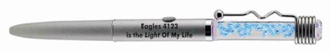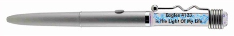 | 7 Color Lite Up Ball Point Pens: These metallic silver metal pens are a ton of fun and pretty to look at. Great 1/2 time Doorprize, or if your budget allows, buy one for every customer. Click the button located on the barrel to illuminate the colors, and twist the bottom to write (twisting pushes the ink cartridge out - twist again to close). NOTE: Each time you push the button, a NEW COLOR lights up! Once you have illuminated each of the 6 colors, the 7th color automatically rotates all the colors over and over again! Push the button again to light up just one color & repeat pattern. INCLUDED: Comes with batteries installed in each pen. Choose from Swirl or Air Bubble pattern inside the light area. We can imprint your organization's name either on the silver barrel (center of pen) or on the light area (see above) Minimum order only 100 pcs. |
