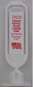 | Swivel Admission Ticket Holder! This fantastic new holder stands 5 1/2" tall and is 1 7/8" wide. The swivel base allows the player to position their admission card or winning pull tab as they see fit. The large imprint area gives your game maximum visibility at your hall (and at the competition) when the player uses it there too! We'll print your information in just about any color and we can add a bingo card at no additional cost! NOTE: Bottom of base has 'sticky' pad to help hold (although the item will stand without it). It is designed to be used over and over...simply wet bottom when it starts to lose sticking ability. IDEA!! For any Patriotic Holiday, we can add a waving flag next to your information at no extra charge! Optional Slogans: Proud to be an American! United we Stand! |