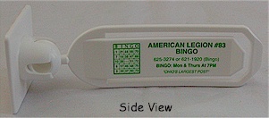 | Swivel Admission Ticket Holder! This fantastic new holder stands 5 1/2" tall and is 1 7/8" wide. The swivel base allows the player to position their admission card or winning pull tab as they see fit. The large imprint area gives your game maximum visibility at your hall (and at the competition) when the player uses it there too! We'll print your information in just about any color and we can add a bingo card at no additional cost! NOTE: Bottom of base has 'sticky' pad to help hold (although the item will stand without it). It is designed to be used over and over...simply wet bottom when it starts to lose sticking ability. |